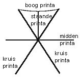 De staande-printa (ca 2 cm langer dan de helft van de kruis-printa ) wordt zó op een der benen van de kroisi-printa diagonaal geplaatst, dat de twee uiteinden gelijk komen te liggen. Nu "scharniert" men hem naar links of naar rechts tot hij loodrecht op de midden-printa staat en maakt hem ook in het snijpunt vast. |