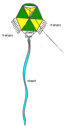 de midden-printa's en de onderste benen van de kroisi-printa, diagonaal. Voor deze franja's knipt men een stuk vliegerpapier, met de breedte gelijk aan de afstand tussen de bovengenoemde uiteinden (lengte onbeperkt), in heel dunne reepjes. De reepjes moeten niet over de gehele lengte worden doorgeknipt; er moet n.l. een dwarse strook papier overblijven waarmee zo'n stel franja's aan de vlieger geplakt wordt.