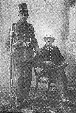 Foto uit 1900: Een politieagent ( zittend rechts ) en een soldaat |