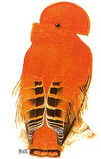 Mannetje: met uitzondering van de vleugels geheel oranje. De kop is van de snavel tot aan de nek versierd met een