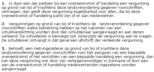 Een vergunning, verleend op grond van bij of krachtens deze verordening gegeven voorschriften, heft de verplichtingen en werkingen, welke met betrekking tot onder deze landsverordening en de vermogensbestanddelen uit anderen hoofde zijn opgelegd, op.