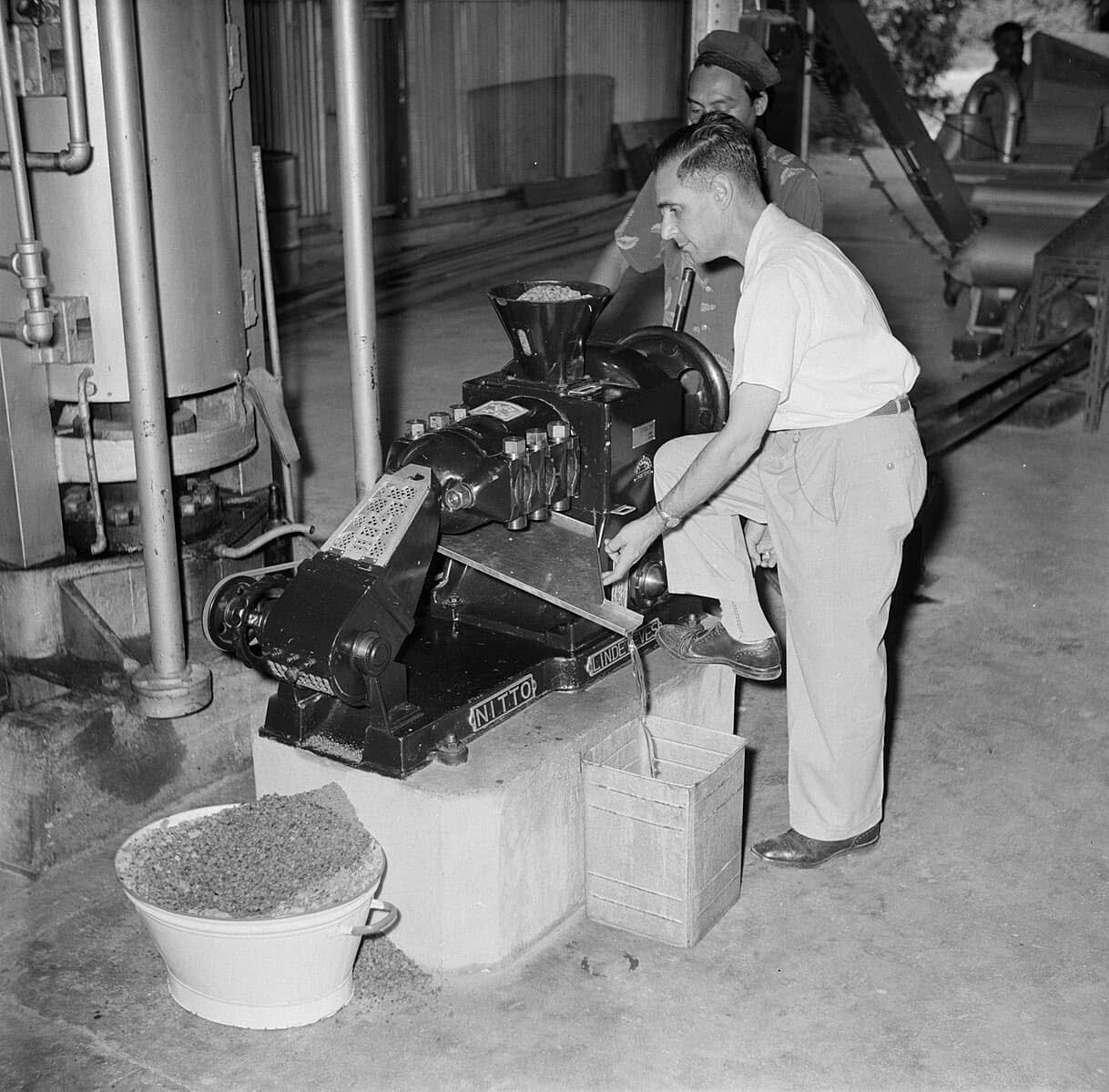 In 1955 demonstreerde de firma Nitto Lindeteves in Suriname deze oliepers-machine.
