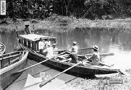 De watertaxi, toen nog zonder buitenboordmotor. Aangedreven door "mensenkracht" . Niet zelden moesten de betalende passagiers meehelpen met roeien.