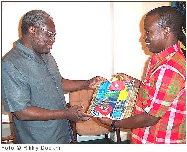 Kunstenaar Marcel Pinas overhandigde een catalogus aan president Ronald Venetiaan. Hierin zijn ruim 100 werkstukken opgenomen die de kunstenaar de afgelopen vijf jaar heeft gemaakt. Kibri a Kulturu is de titel van de catalogus.