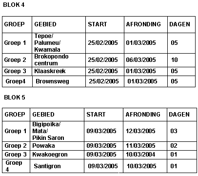 Er zijn in april 2004 twee missies uitgevoerd naar de volgende gebieden in het district Brokopondo: Kwakoegron, Brownsberg, Centrum en Klaaskreek.