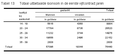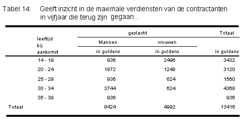 Contractueel was vastgelegd dat een werkweek 6 werkdagen telt. Het dagloon voor mannen bedraagt 60 cent en voor vrouwen en kinderen tussen 10 en 16 jaar 40 cent per dag. In een jaar wordt in deze exercitie globaal uitgegaan van 312 werkdagen. Op grond van de veronderstellin-gen heeft globaal genomen, zonder rekening te houden op uitval door overlijden, de plantage eigenaren is in de eerste vijf contractjaren maximaal bijna 77 duizend gulden aan loonkosten aan de 92 volwassen contractanten uitbetaald (2 minderjarigen niet bijgeteld). (m=1: 5*312*0,60 en v=2: 5*312*0,40).