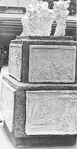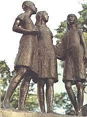 Op de sokkel van het monument zijn drie staande meisjesfiguren aangebracht, die de drie grootste bevolkingsgroepen van Suriname voorstellen. Tegen de sokkel |