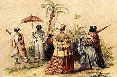 Klederdracht uit die tijd, van zowel "de vrijen" als de slaven.