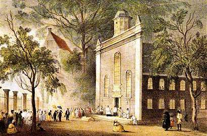 Rooms Katholieke kerk voor de brand van 1832, met begrafenis stoet. Op de plaats waar nu de st. Petrus en Paulus kathedraal staat, stond het gebouw