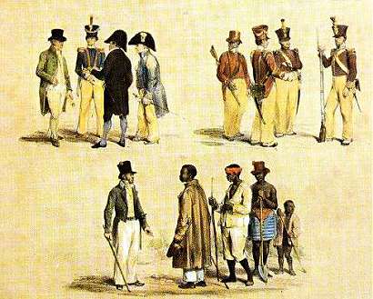 Diverse Uniformen van die tijd. Linksboven : Gezagsdragers en officieren. Rechtsboven: Een soldaat, een schutter, een kannonier en een officier van het vrije korps.