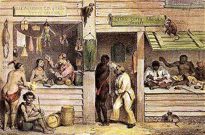 Rechts een "snerie" of kleermaker, eigenaar; Petro Cofey Abouka, die net van een klant de maat neemt.