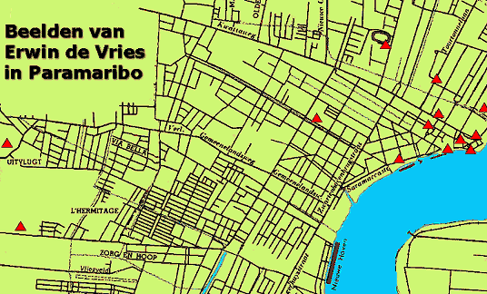 Hieronder een overzichtskaart van de beelden van Erwin de Vries in Paramaribo