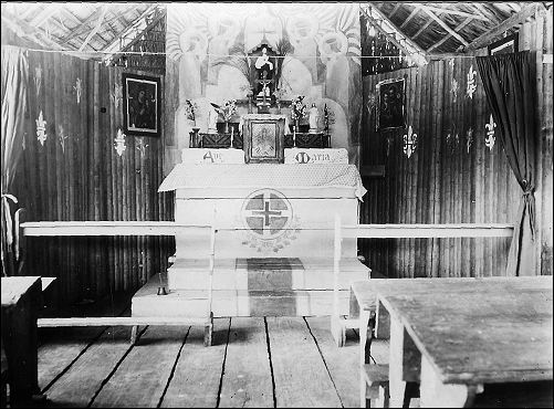 4. Kerkje van Donderkreek (Indianendorp) Muren gespleten bamboelatten. Dak, palmbladeren. Dient tevens voor school wat aan de banken te zien is.