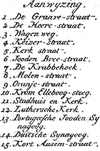 11. Stadhuis en Kerk, 12. Lutherse Kerk, 13. Port. Jooden Synagoge, 14. Duitsche Synagoge en 15. de Kort Aasemstraat (het verlengde van de Keizerstraat