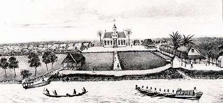 schelprits, rijk met palmboomen beplant, en Batavia geheten: aan de water