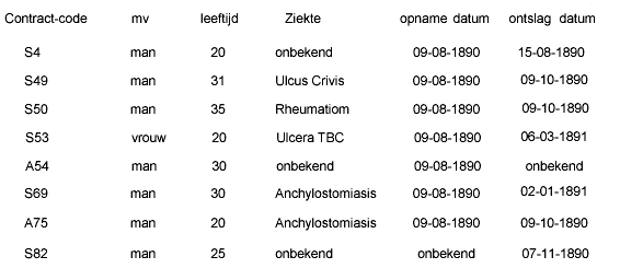 De klachten zijn respectievelijk ulcus crivis, rheumatom, ulcera tuberculose, anchylotomiasis. Anchilostomias is duidelijk een ziekte van die tijd geweest. Bij een aantal contactanten waren de klachten niet bekend. Tabel 3 geeft inzicht van de gezondheidstoestand van de contractanten bij aankomst.
