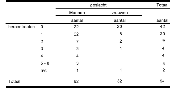 42 van de 94 contractanten blijken na het aflopen van de eerste vijfjarige contract periode niet opnieuw bijgetekend te hebben. Zes mensen hebben het eerste contract door overlijden niet kunnen verlengen (twee mannen en vier vrouwen). Naar geslacht bezien bedragen de percentages respectievelijk 35% mannen en 62% bij vrouwen.