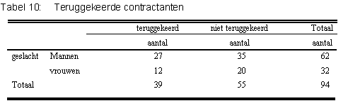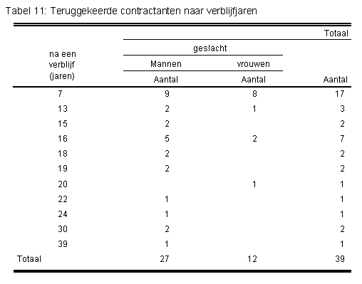 Tabel 10 geeft een overzicht van het aantal migranten naar geslacht die na verloop van tijd terug zijn gegaan naar hun vaderland. Uit de tabel blijkt dat 39 van 94 mensen weer naar Indonesië is terug gegaan. Na de eerste contract periode zijn er relatief gezien veel meer mannen (43,5%) dan vrouwen (34,4%) geremigreerd.