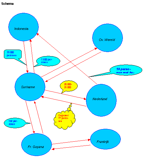 Wie gedacht zou hebben, dat de Surinaamse Javanen alleen in Suriname zouden verblijven of na de contract periode (of later) terug zijn gegaan naar Indonesia heeft het volkomen mis gehad. Want mede door de politieke instabiliteit van Suriname, door het uitroepen van de onafhankelijkheid van Suriname in 1975 en daarna de in 1980 gepleegde sergeantenstaatsgreep en de daaropvol-gende excessen en sociaal -economische malaise van Suriname zijn vele Surinaamse Javanen naar Nederland of elders in de wereld vertrokken om hun geluk te beproeven. Onderstaand sche-ma laat in eerste instantie in hoofdlijnen de verspreiding van de Surinaamse Javanen zien.