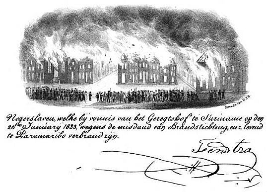 De grote brand in Paramaribo van 3 op 4 september 1832 is aangestoken door de slaven die in opstand kwamen: Cojo (ook wel Andries genaamd), Mentor (alias Geluk) en Present.