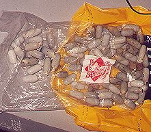 Vrouwen verstoppen de drugs soms op de vreemdste plaatsen. (Rechts de grootte)